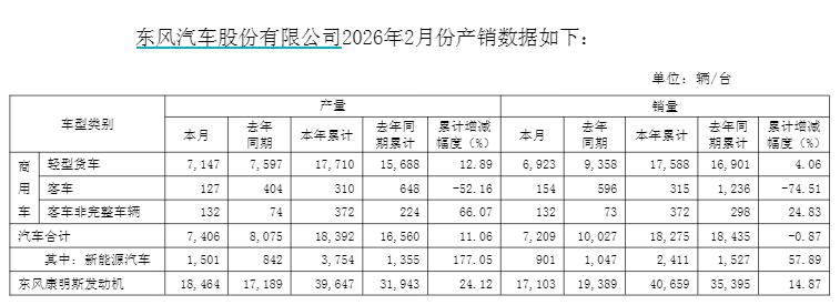 【大河财立方消息】3月6日,东风股份发布公告,2026年2月,公司汽车产量合计7406辆,本年累计产量1.84万辆,累计产量同比增长11.06%;2月销量7209辆,本年累计销量1.83万辆,累计销量同比下降0.87%。其中,新能源汽车2月销量901辆,本年累计销量2411辆。